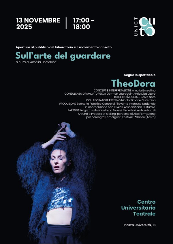 Giovedì 13 novembre alle 17, al Centro Universitario Teatrale (Piazza Università 13, Catania), si svolge la performance finale del laboratorio sul movimento danzato "Sull'arte del guardare", condotto dalla danzatrice Amalia Borsellino.