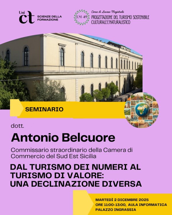 Martedì 2 dicembre alle 11, nell'aula informatica di Palazzo Ingrassia (Dipartimento di Scienze della Formazione, Via Biblioteca 4 - Catania), Antonio Belcuore (commissario straordinario della camera di commercio del Sud Est Sicilia), tiene il seminario dal titolo "Dal turismo dei numeri al turismo di valore: una declinazione diversa".