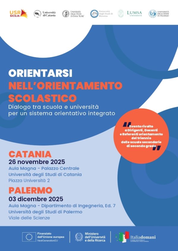 L'iniziativa è organizzata dall’Ufficio scolastico regionale per la Sicilia, in collaborazione con le Università di Catania, Enna, Messina, Palermo e LUMSA di Palermo. Destinatari della formazione saranno dirigenti scolastici, docenti referenti per l’orientamento e/o tutor orientatori del triennio delle scuole secondarie di 2° grado.