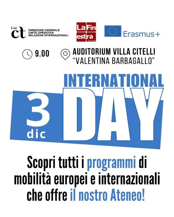 Mercoledì 3 dicembre alle 9, nell'auditorium "Valentina Barbagallo" di Villa Citelli, l'associazione studentesca "La Finestra - Liberi di scegliere" e l'Unità operativa Relazioni Internazionali dell'Università di Catania, organizzano l'iniziativa "International Day".