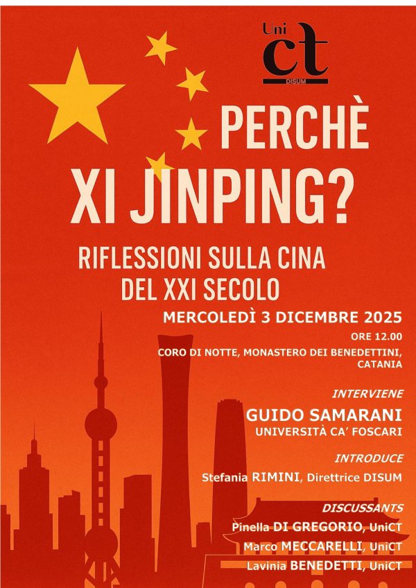 Mercoledì 3 dicembre alle 12, al Coro di notte del Monastero dei Benedettini (Dipartimento di Scienze umanistiche), il prof. Guido Samarani (Università Ca’ Foscari di Venezia) - tra i massimi studiosi italiani della Cina contemporanea e della sua evoluzione storica, politica e culturale - tiene il seminario dal titolo "Perché Xi Jinping? Riflessioni sulla Cina del XXI secolo".