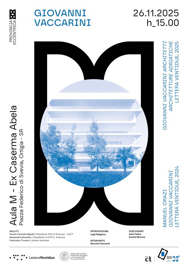 Mercoledì 26 novembre alle 15, nell’aula M dell’Ex Caserma Abela a Siracusa, si tiene la conferenza dal titolo: “Giovanni Vaccarini”, nell'ambito della rubrica “Provincia eccentrica”. È previsto l’intervento di Giovanni Vaccarini, architetto, ricercatore e fondatore dello studio "Giovanni Vaccarini Architects".