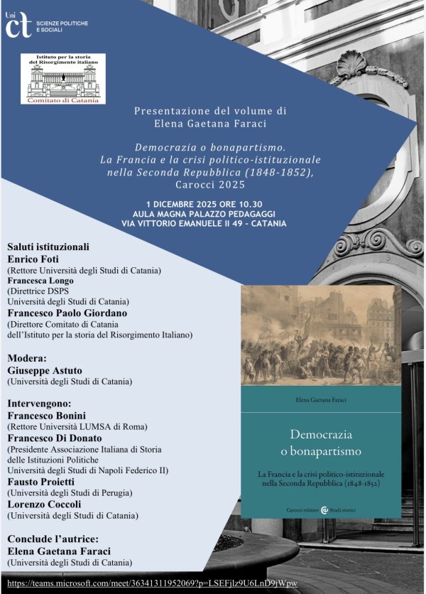 Lunedì 1 dicembre alle 10:30, nell'aula magna di Palazzo Pedagaggi e online su MS Teams, si tiene la presentazione del volume di Elena Gaetana Faraci: "Democrazia o bonapartismo. La Francia e la crisi politico-istituzionale nella Seconda Repubblica (1848-1852)", Carocci editore.