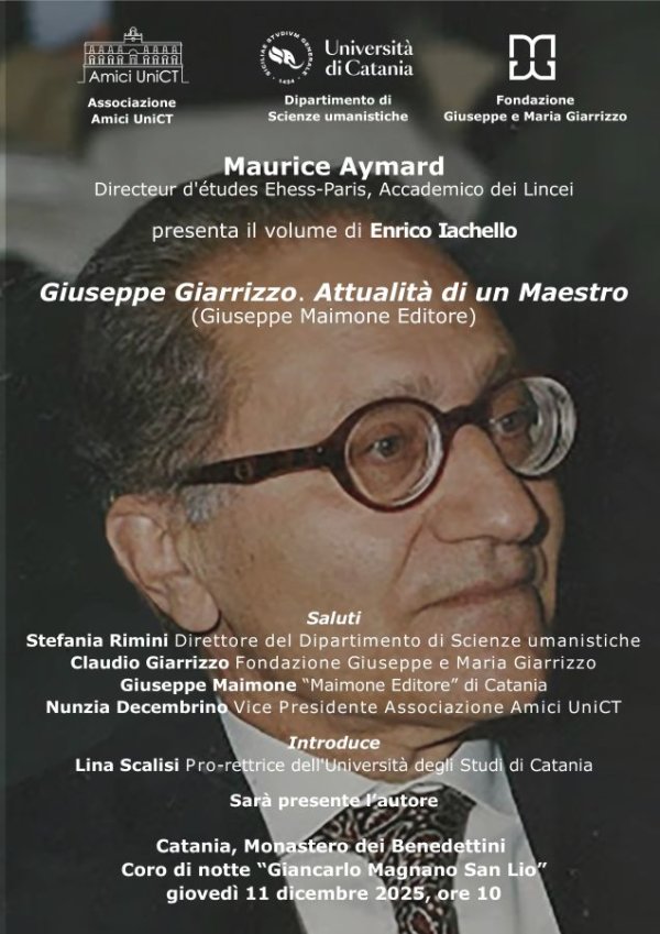 Giovedì 11 dicembre alle 10, al Coro di notte del Monastero dei Benedettini, Maurice Aymard (Directeur d'études dell’EHESS di Parigi e Accademico dei Lincei) presenta il volume di Enrico Iachello dal titolo "Giuseppe Giarrizzo - Attualità di un Maestro" (Maimone editore), organizzato dall'Associazione Amici dell’Università di Catania, dal Dipartimento di Scienze umanistiche e dalla Fondazione Giuseppe e Maria Giarrizzo.