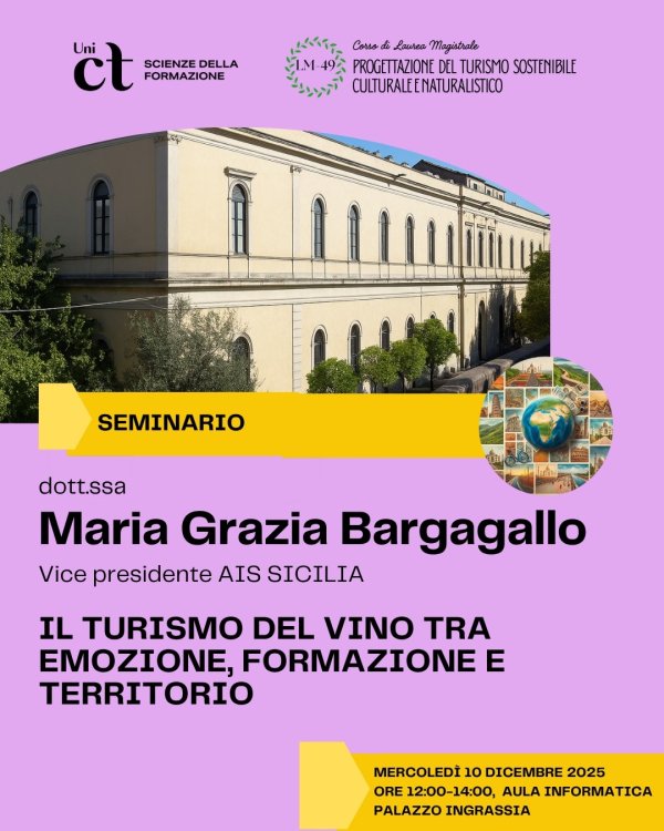Mercoledì 10 dicembre alle 12, nell'aula informatica di Palazzo Ingrassia (Dipartimento di Scienze della Formazione, Via Biblioteca 4 - Catania), Maria Grazia Barbagallo (Vicepresidente AIS Sicilia), tiene il seminario dal titolo "Il turismo del vino tra emozione, formazione e territorio".