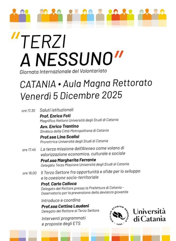 Venerdì 5 dicembre alle 17:30, nell'aula magna del Palazzo Centrale dell'Università di Catania, si svolge la tavola rotonda "Terzi a nessuno", promossa in occasione della Giornata Internazionale del Volontariato.
