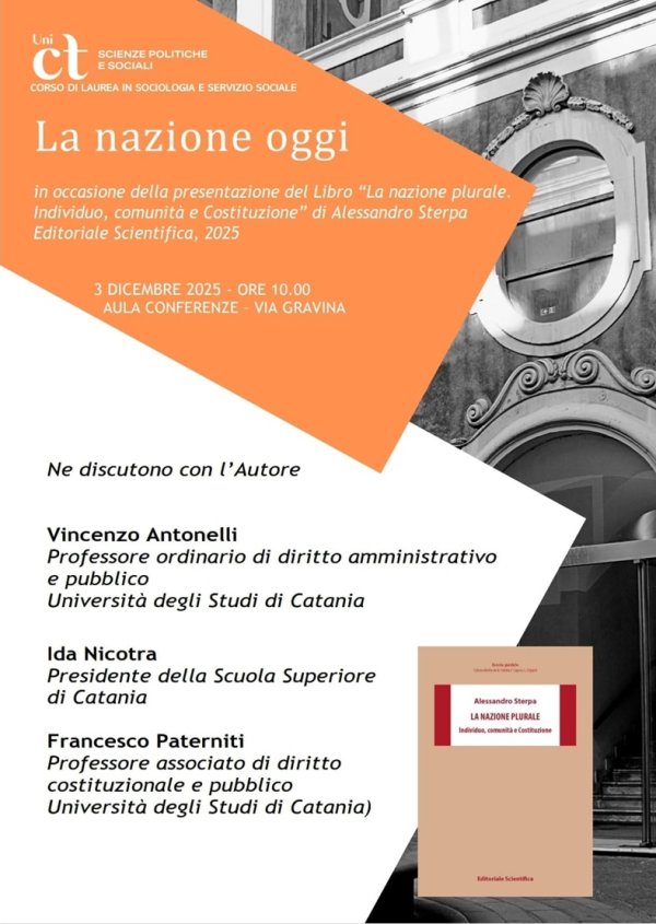 Mercoledì 3 dicembre alle 10, nella sala conferenze del Polo didattico "Gravina", si tiene l’incontro “La nazione oggi”, organizzato dal Corso di Laurea in Sociologia e Servizio Sociale del Dipartimento di Scienze Politiche e Sociali.