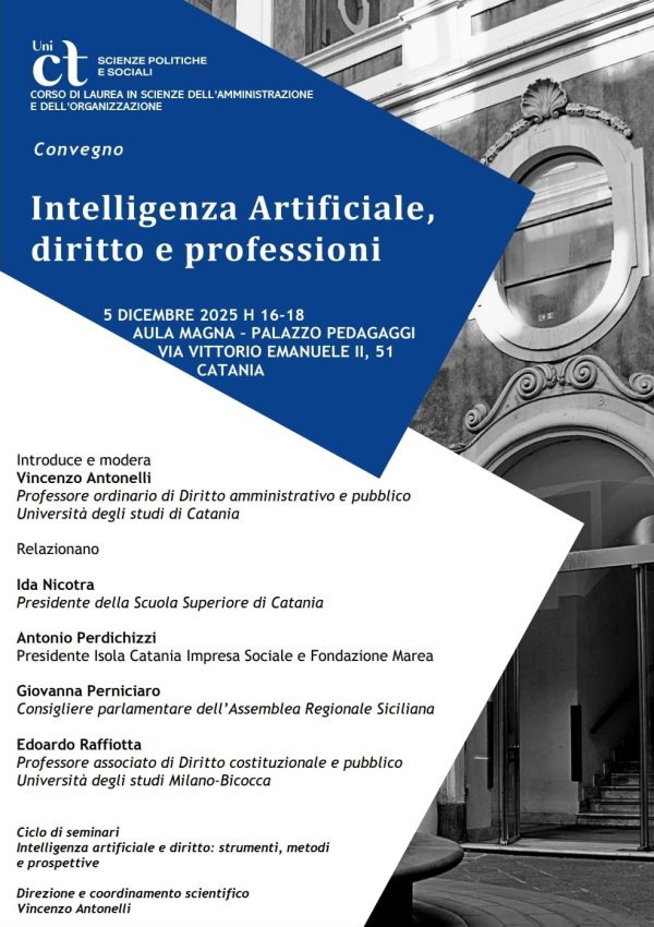 Venerdì 5 dicembre alle 16, nell'aula magna di Palazzo Pedagaggi (Dipartimento di Scienze politiche e sociali, Via Vittorio Emanuele II, 51 - Catania), si svolge l'iniziativa "Intelligenza Artificiale, diritto e professioni", convegno conclusivo del ciclo di seminari "Intelligenza Artificiale e Diritto: strumenti, metodi e prospettive", promosso nell'ambito delle attività didattiche del corso di laurea in "Scienze dell'Amministrazione e dell'Organizzazione".