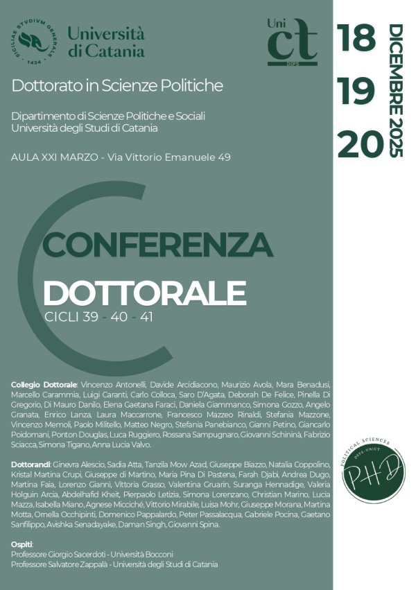 Da giovedì 18 a sabato 20 dicembre, nell'aula "XXI marzo" di Palazzo Pedagaggi (via Vittorio Emanuele II, 49 - Catania), si svolge l'incontro annuale del Dottorato di ricerca in Scienze Politiche, che intende presentare le attività scientifiche che giovani studiose e studiosi dei cicli 39, 40 e 41 mirano a portare all’attenzione della comunità accademica e della città.