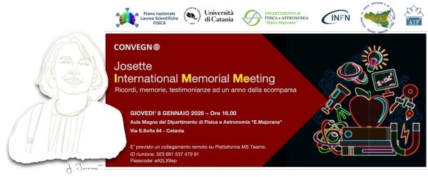 Giovedì 8 gennaio alle 16, nell’aula magna del Dipartimento di Fisica e Astronomia “Ettore Majorana” e online su MS Teams, si tiene il convegno “Josette International Memorial Meeting”, dedicato al ricordo e alla memoria della professoressa Josette Immè.