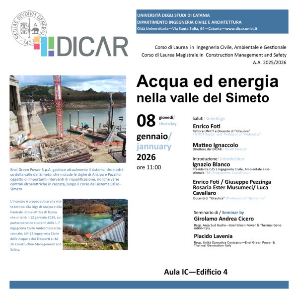 Giovedì 8 gennaio alle 11, nell’aula IC dell'Edificio per la Didattica di Ingegneria, si tiene il seminario dal titolo “Acqua ed energia nella valle del Simeto”, organizzato dal Dipartimento di Ingegneria Civile e Architettura dell’Università di Catania, nell’ambito del Corso di Laurea in Ingegneria Civile, Ambientale e Gestionale e del Corso di Laurea Magistrale in Construction Management and Safety.