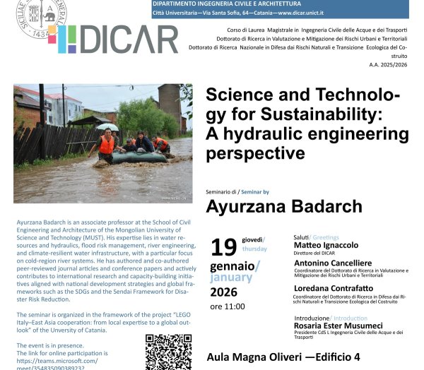 Il prof. Badarch è attualmente in visita presso il Dipartimento di Ingegneria civile e architettura (DICAR) nell’ambito del progetto di scambio internazionale “LEGO Italy–East Asia cooperation: from local expertise to a global outlook” promosso dall’Università di Catania.