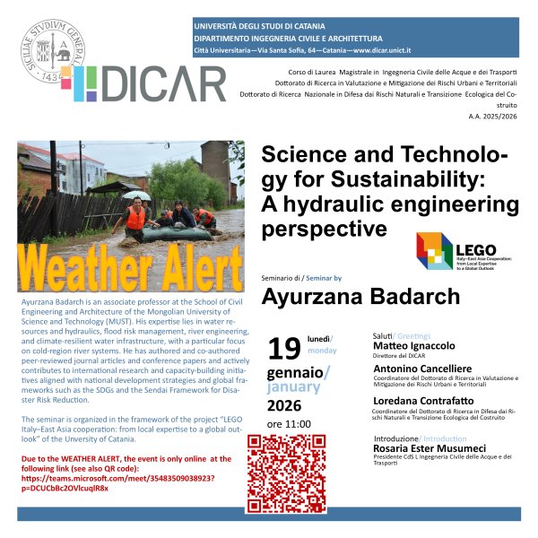 Lunedì 19 gennaio, alle 11, si terrà il webinar dal titolo “Science and Technology for Sustainability: A Hydraulic Engineering Perspective”, tenuto da Ayurzana Badarch, docente della School of Civil Engineering and Architecture della Mongolian University of Science and Technology.
