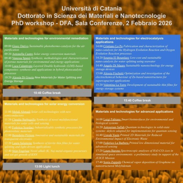 Lunedì 2 febbraio dalle 9, nella sala conferenze del Dipartimento di Fisica e Astronomia dell'Università di Catania, si svolge il workshop del Dottorato in Scienza dei Materiali e Nanotecnologie.
