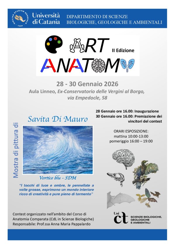Dal 28 al 30 gennaio, nell'aula Linneo dell’Ex Conservatorio delle Vergini al Borgo (via Empedocle 58, Catania), si svolge la seconda edizione del contest “Art Anatomy”, iniziativa che coniuga espressione artistica e studio scientifico dell’anatomia comparata.