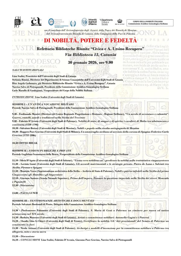 Venerdì 30 gennaio alle 9, nel Refettorio delle Biblioteche Riunite “Civica e A. Ursino Recupero” (via Biblioteca 13, Catania), si terrà il convegno "Di nobiltà, potere e fedeltà", dedicato allo studio della nobiltà in Sicilia dall’età medievale al Settecento.