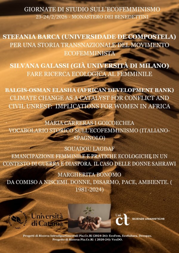 Lunedi 23 e martedì 24 febbraio, al Coro di notte "Giancarlo Magnano San Lio" del Monastero dei Benedettini, si terranno le Giornate di studio sull’Ecofemminismo, nell’ambito dei Progetti di Ricerca Intradipartimentali Pia.Ce.Ri (2024-26): EcoFem, EcoSahara, Decopax e Pia.Ce.Ri (2020-24) "Voci di donne. Studi storici, religiosi e linguistici".