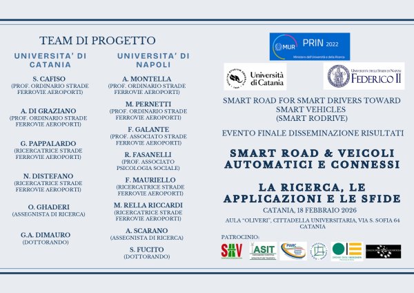 Mercoledì 18 febbraio alle 15, nell’aula magna “E. Oliveri” del Dipartimento di Ingegneria Elettrica, Elettronica e Informatica (via Santa Sofia 64, Catania), si svolge il workshop "Smart Road & Veicoli automatici e connessi. La ricerca, le applicazioni e le sfide", nel corso del quale saranno presentati i risultati del progetto PRIN22 Smart Road for Smart Drivers toward Smart Vehicles (SMART RoDriVe).