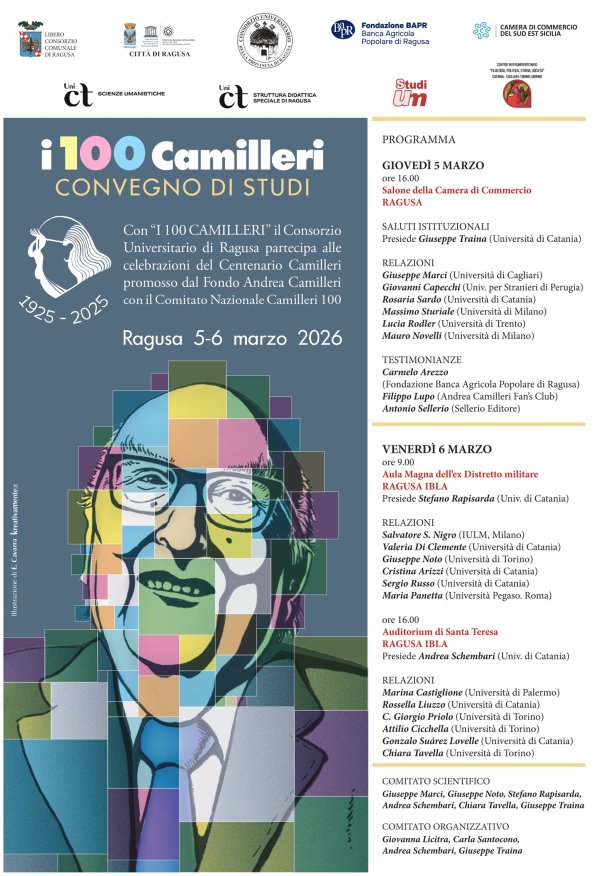 Giovedì 5 marzo alle 16, nel Salone della Camera di Commercio di Ragusa e venerdì 6 marzo alle 9 e alle 16, nelle sedi della Struttura Didattica Speciale di Ragusa, si svolge il convegno di studi "I 100 Camilleri", in occasione del centenario della nascita di Andrea Camilleri.