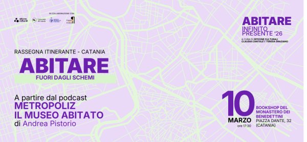Martedì 10 marzo alle 17:30, nel bookshop del Monastero dei Benedettini di Catania, si tiene “Abitare - Fuori dagli schemi”, a partire dal podcast "Metropoliz – il museo abitato" di Andrea Pistorio. L’incontro inaugura la rassegna itinerante “Abitare, infinito presente ’26”, a cura di Officine Culturali, di Claudia Cantale, sociologa dei processi culturali e comunicativi (Università di Catania), e di Teresa Graziano, geografa economico-politica (Università di Catania), in collaborazione con Catania Book Festival e Società Geografica Italiana. Un ciclo di appuntamenti aperti al confronto per esplorare insieme la dimensione dell’abitare lo spazio attraverso opere, visioni e punti di vista di esperte ed esperti: un punto di partenza per intraprendere, insieme, un viaggio nella contemporaneità.