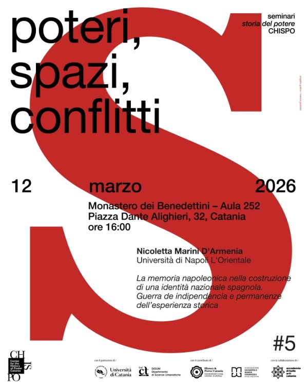 Giovedì 12 marzo alle 16, nell'aula 252 del del Monastero dei Benedettini (Dipartimento di Scienze Umanistiche), prosegue il ciclo di seminari "Poteri, spazi, conflitti", organizzato dal CHISPO - Center for the History of Power (Fondazione Giarrizzo - Università di Catania), diretto dalla prof.ssa Lina Scalisi e coordinato dal dott. Giacomo Santoro.