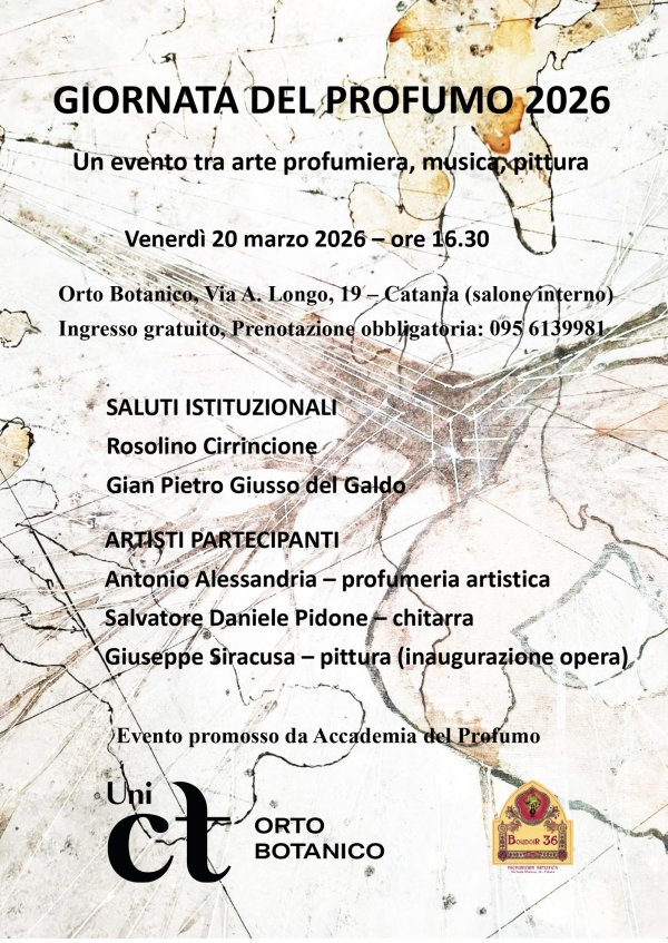 Venerdì 20 marzo alle 16:30, nel salone interno dell'Orto Botanico di Catania, si svolge la “Giornata del Profumo 2026”, un'iniziativa tra arte profumiera, musica e pittura, organizzata in occasione della Giornata Nazionale del Profumo, promossa dall’Accademia del Profumo e dalla Società Botanica Italiana.