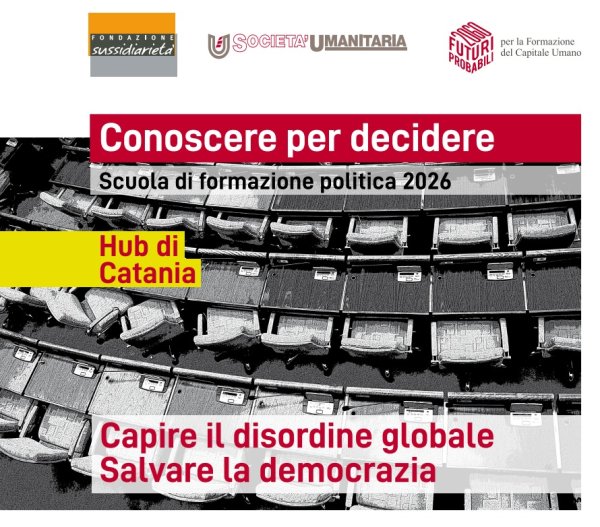 Venerdì 20 marzo alle 17, nell'aula 6 di Palazzo delle Scienze (Dipartimento di Economia e Impresa), si svolge l'incontro dal titolo "L’Occidente e la Cina nella nuova geopolitica", secondo appuntamento della Scuola di formazione politica 2026 "Conoscere per decidere", organizzata dalla Fondazione per la Sussidiarietà in collaborazione con l'Università di Catania.