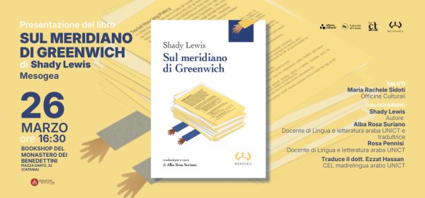 Giovedì 26 marzo alle 16:30, nel bookshop del Monastero dei Benedettini si tiene la presentazione del romanzo dello scrittore egiziano Shady Lewis “Sul meridiano di Greenwich”, pubblicato da Mesogea e tradotto e curato da Alba Rosa Suriano. A cura di Officine Culturali.