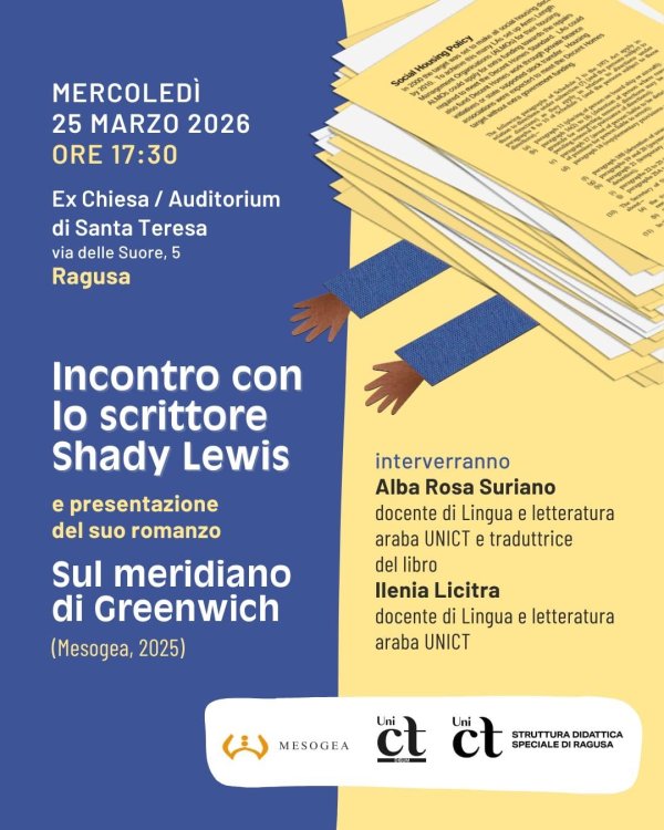 Mercoledì 25 marzo alle 17:30, nell’ex Chiesa di Santa Teresa a Ragusa Ibla, si terrà la presentazione del romanzo "Sul meridiano di Greenwich" dello scrittore egiziano Shady Lewis.