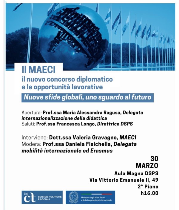 Lunedì 30 marzo alle 16, nell'aula magna di Palazzo Pedagaggi, si tiene l'incontro “Il MAECI: il nuovo concorso diplomatico e le opportunità lavorative. Nuove sfide globali, uno sguardo al futuro”.