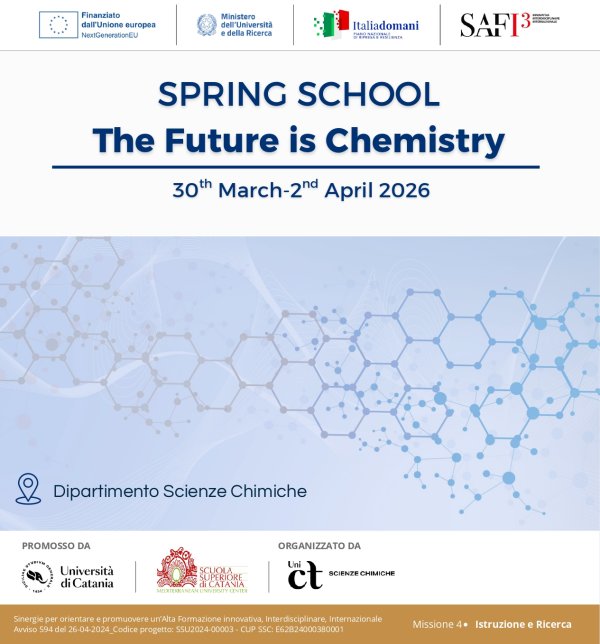 Dal 30 marzo al 2 aprile, al Dipartimento di Scienze Chimiche (Cittadella Universitaria, viale Andrea Doria, 6, Catania), si svolge la Spring School “The Future is Chemistry”, un'iniziativa formativa di alto livello finanziata dalla Scuola Superiore di Catania nell'ambito del progetto SAFI3 - Scuola di Alta Formazione Interdisciplinare per l'Innovazione e la Internazionalizzazione.