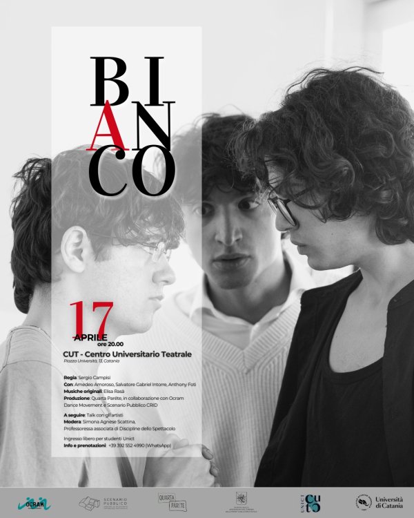 Venerdì 17 aprile alle 20, al CUT - Centro Universitario Teatrale dell'Università di Catania, va in scena lo spettacolo teatrale/mostra di arte contemporanea "Bianco", liberamente ispirato all’opera “Art” di Jasmine Reza. Regia di Sergio Campisi, con Amedeo Amoroso, Salvatore Gabriel Intorre e Anthony Foti. Seguirà un talk con gli artisti, moderato dalla docente Simona Scattina.