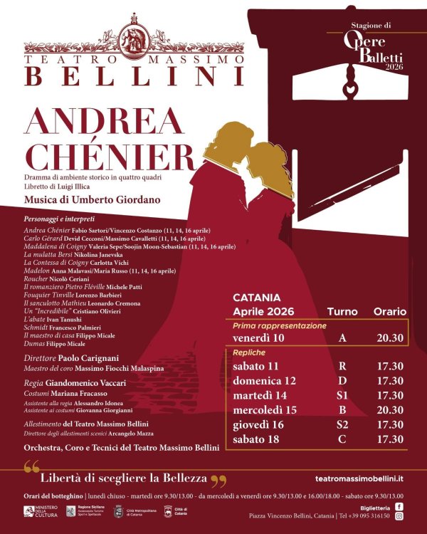 Giovedì 9 aprile alle 16.30, nel foyer del Teatro Bellini di Catania, si presenta l’opera Andrea Chénier di Umberto Giordano.