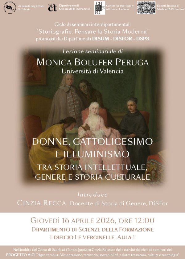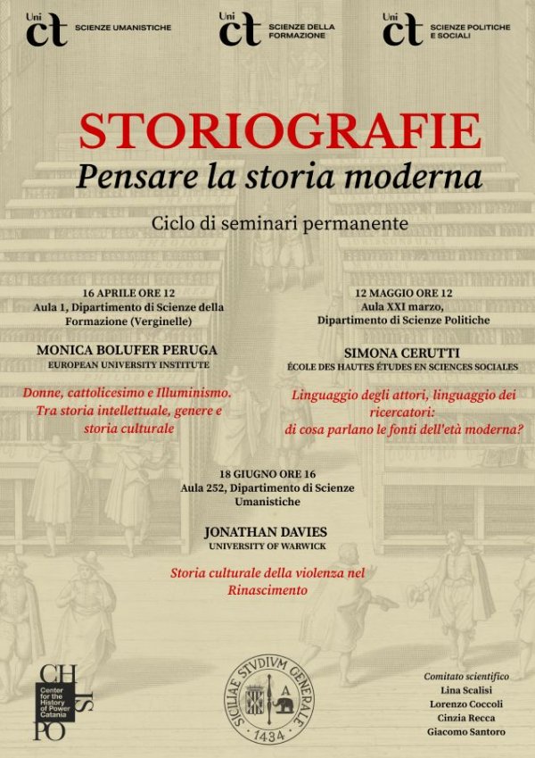 L'appuntamento fa parte inoltre del ciclo interdipartimentale di seminari “Storiografie - Pensare la Storia Moderna”, organizzato dal CHISPO - Center for the History of Power (Fondazione Giarrizzo - Università di Catania) con il coinvolgimento dei Dipartimenti di Scienze umanistiche, Scienze della Formazione e Scienze politiche e sociali.