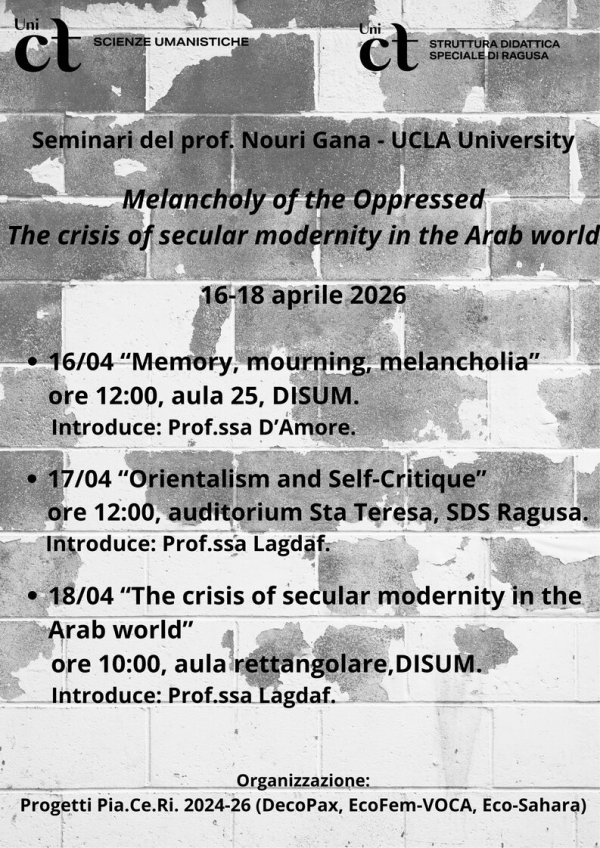 Dal 16 al 18 aprile, al Monastero dei Benedettini e all'Auditorium di Santa Teresa (Ragusa), si terrà il ciclo di seminari “Melancholy of the Oppressed. The crisis of secular modernity in the Arab world”, organizzato dal Dipartimento di Scienze umanistiche e dalla SDS di Ragusa nell’ambito dei Progetti di Ricerca Intradipartimentali Pia.Ce.Ri (2024-2026): EcoFem, EcoSahara, Decopax.
