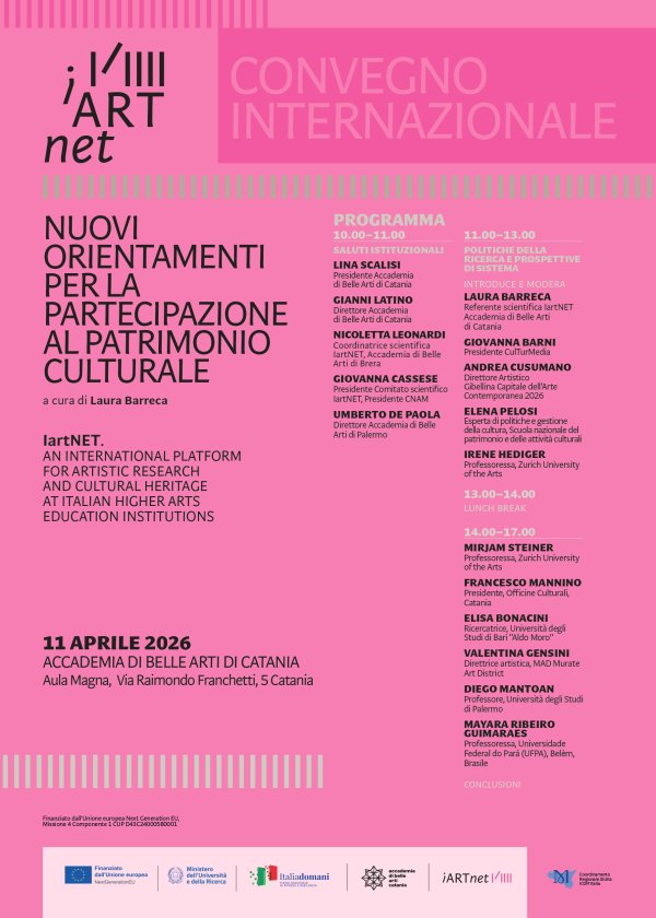 Sabato 11 aprile alle 10, nell'aula magna dell’Accademia di belle arti di Catania (via Franchetti 5), si tiene il convegno internazionale “Nuovi orientamenti per la partecipazione al patrimonio culturale”, a cura di Laura Barreca, nell'ambito del progetto “IartNET. An International Platform for Artistic Research and Cultural Heritage at Italian Higher Arts Education Institutions” e si propone di approfondire i nuovi approcci e i modelli di progettazione che stanno ridefinendo il rapporto tra comunità e patrimonio culturale.