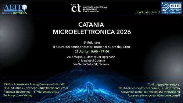 Lunedì 27 aprile alle 9, nell'aula magna "Didattica" di Ingegneria (Edificio 14, Cittadella Universitaria), si tiene la quarta edizione di "Catania Microelettronica". L’evento organizzato dal DIEEI e da AEIT sez. di Catania, rappresenta un importante momento di raccordo tra i percorsi formativi dell’Ateneo e le realtà industriali e di ricerca che operano nel comparto dei semiconduttori e dei sistemi integrati.