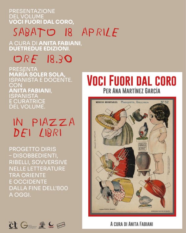 Sabato 18 aprile alle 18.30, presso Gammazita (piazza Federico di Svevia 90-94, Catania), si terrà la presentazione del libro "Voci fuori dal coro", a cura di Anita Fabiani (Duetredue Edizioni), con l'ispanista e docente María Soler Sola.