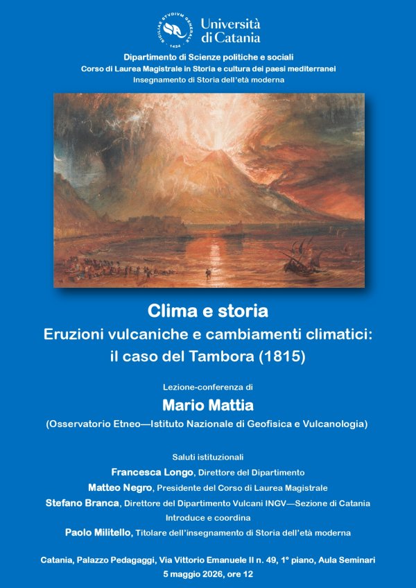 Martedì 5 maggio alle 12, nell’Aula seminari di Palazzo Pedagaggi (via Vittorio Emanuele II n. 49, Catania), si terrà una lezione-conferenza dal titolo "Clima e storia. Eruzioni vulcaniche e cambiamenti climatici: il caso del Tambora (1815)".