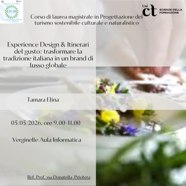 Martedì 5 maggio alle 9, nell'aula informatica del Plesso Le Verginelle (Dipartimento di Scienze della Formazione), Tamara Elina (Travel and Event Designer, Bella Italy Travel), tiene il seminario dal titolo "Experience Design e itinerari del gusto: trasformare la tradizione italiana in un brand di lusso globale".
