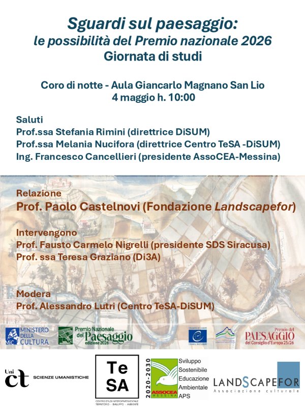 Lunedì 4 maggio alle 10, al Coro di notte (aula Giancarlo Magnano San Lio) del Monastero dei Benedettini di Catania, si tiene la giornata di studi “Sguardi sul paesaggio: le possibilità del Premio nazionale 2026”. L’iniziativa è organizzata dal Centro interdipartimentale Territorio, Sviluppo e Ambiente (TeSA) dell’Università di Catania, in occasione della partecipazione al Premio Nazionale del Paesaggio con la candidatura del progetto paesaggistico siciliano Geloi Wetland, premiato con una menzione.