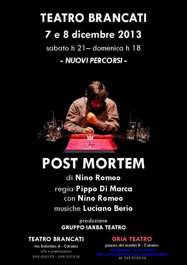 Sabato 7 (ore 21) e domenica 8 dicembre (ore 18), al Teatro Brancati di Catania, andrà in scena Post Mortem di Nino Romeo.