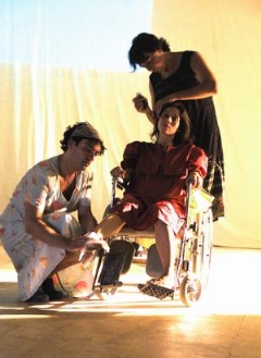 Un dramma sulla schiavitù moderna. In Italia la stragrande maggioranza delle migranti rumene trova occupazione come badante presso le abitazioni di anziane bisognose di cure o nelle case di giovani donne afflitte da handicap. Per i rumeni di sesso maschile trovare lavoro risulta invece assai più complicato. Questa semplice analisi occupazionale compiuta sulla comunità col maggior numero di presenze in Italia, mi ha rimandato con sorpresa alle Serve di Jean Genet, e in particolare al suo gioco delle apparenze portato alle estreme conseguenze. Nello spettacolo dunque, Emil e George fingono di essere due donne riuscendo ad accaparrarsi i due posti di badante di cui Olga, una giovane paraplegica ha bisogno. Qui si genera un prima finzione teatrale, in verità preceduta da altre finzioni: i migranti rumeni sono interpretati da due attori italiani; Olga da una “sanissima” attrice. Questa scelta mi ha permesso di affrontare la materia da un punto di vista più prettamente politico, rifuggendo a priori tutto ciò che sarebbe potuto scadere in un smielato buonismo. Olga controlla, spia, ruba frammenti di vita a Emil e George. L’erotica morbosità con la quale osserva i due migranti potrebbe essere la risposta al perché faccia finta di non accorgersi che in realtà di fronte a lei si trovano due uomini che, a loro volta, fingono di essere due donne. A questo punto la domanda che ci siamo posti è stata la seguente: quali conseguenze provoca nell’animo umano vivere in un costante clima di umiliazione? Ne è uscita fuori quasi una commedia degli equivoci, che attraverso il lato grottesco della realtà, prova a rendere manifesta la tragedia di tutti i popoli migranti. (G. Massa)