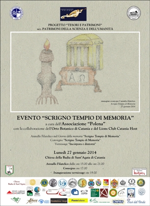 Lunedì 27 gennaio alle 15, la Chiesa Badia di Sant’Agata di Catania ospiterà l’evento Scrigno Tempio di Memoria a cura dell’Associazione “Polena”, in collaborazione con l’Orto Botanico di Catania e il Lions Club Catania Host e Associazione Culturale Salvatore Incorpora.