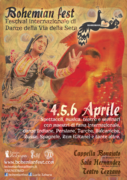 Il Bohemian Fest- Festival Internazionale di danze della Via della Seta ( Danze , Musica , Spettacoli, Seminari, Mostra, Party) si svolgerà presso la Cappella Bonajuto (via Bonajuto 9/13), la Sala Hernandez (via Lorenzo 4) e il Teatro Tezzano (via Tezzano 40) con una serie di stages e workshop di danza e musica. Il tema dell’edizione “Bohemian Fest 2014” è il “Sentiero Rom, un viaggio di Duende”.