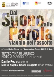 Dal suono alla parola. Viaggio nell'ascolto è il titolo dell'evento che si svolgerà il 3 maggio alle 20:30 nella splendida cornice del Teatro "Tina Di Lorenzo" di Noto. Sul palcoscenico una prestigiosa terna di artisti: il pianista Danilo Rea e i poeti Milo De Angelis e Tiziano Broggiato. L'evento costituisce il risultato di un proficua collaborazione tra Luisa Mazza, artista e curatrice di eventi, e l'Associazione Concerti Città di Noto che da decenni sostiene lo scenario musicale internazionale per promuoverlo in sintonia con le finalità culturali dell'area netina.