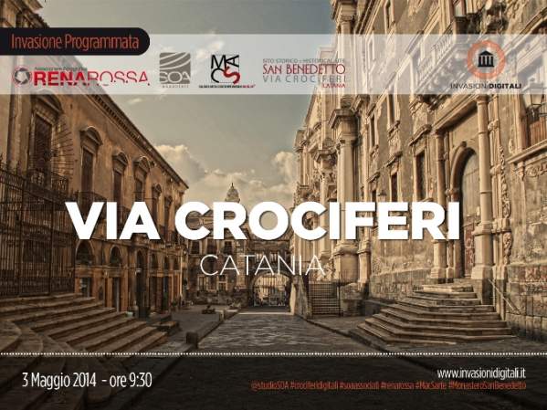 "Invasioni Digitali" è il titolo dell’evento (visita guidata), finalizzato alla valorizzazione e alla promozione dei beni culturali attraverso social media e internet. Diretto da Giuseppina Napoli, e dal Complesso Monumentale Monastero delle Benedettine che hanno sposato l’iniziativa proposta da SOA (Spazio Oltre l’Architettura). Durante la visita guidata, tablet, smartphone e ogni altro supporto tecnologico potranno essere adoperati per condividere su social network e in rete la propria esperienza, attraverso gli hashtag ufficiali dell'evento: #MacSarte#crociferidigitali #MonasteroSanBenedetto #soaassociati #renarossa e anche: #invasionidigitali #siciliainvasa2014 #igerscatania #igersicilia #igersitalia. I biglietti sono disponibili su: http://splashurl.com/kuhgean.