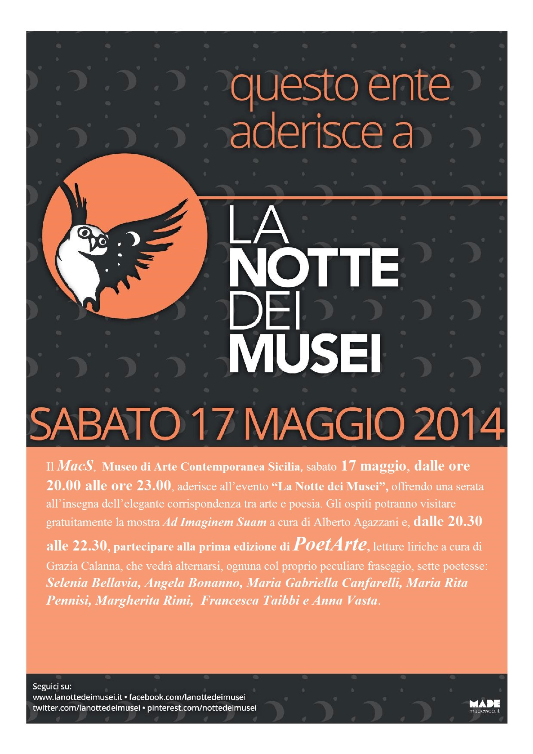 Sabato 17 maggio alle 20, il MacS, Museo di Arte Contemporanea Sicilia di Catania, per "La Notte dei Musei", presenta la prima edizione di PoetArte, offrendo una serata all’insegna dell’elegante corrispondenza tra arte e poesia.