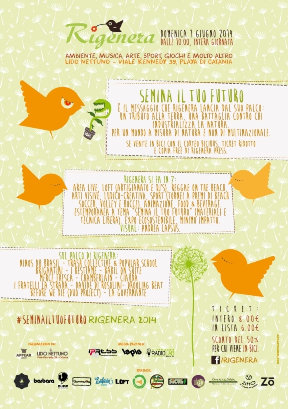 Domenica 1 giugno alle 10, al Lido Nettuno di Catania (viale Kennedy 39 - Plaia), si terrà la quinta edizione dell’eco-festival catanese, Rigenera.