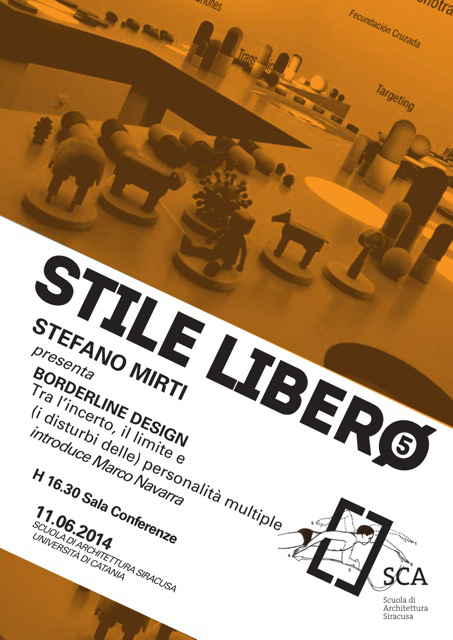- Borderline Design. Tra l’incerto, il limite e (i disturbi delle) personalità multiple: Mercoledì 11 giugno alle 16:30, nella sala conferenze della Scuola di Architettura di Siracusa, conferenza di Stefano Mirti per il quinto appuntamento del ciclo “Stile Libero” (11 giugno 2014)